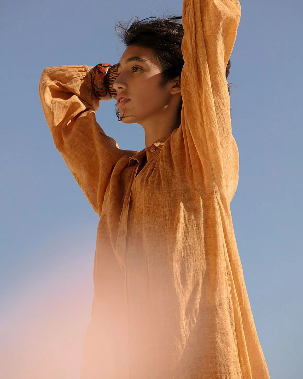 Elégante Alliance Esthétique Entre Les Lignes Décontractées Et Le Tissus Coton Pigment Dye De Notre Longue Chemise Couleur Abricot.