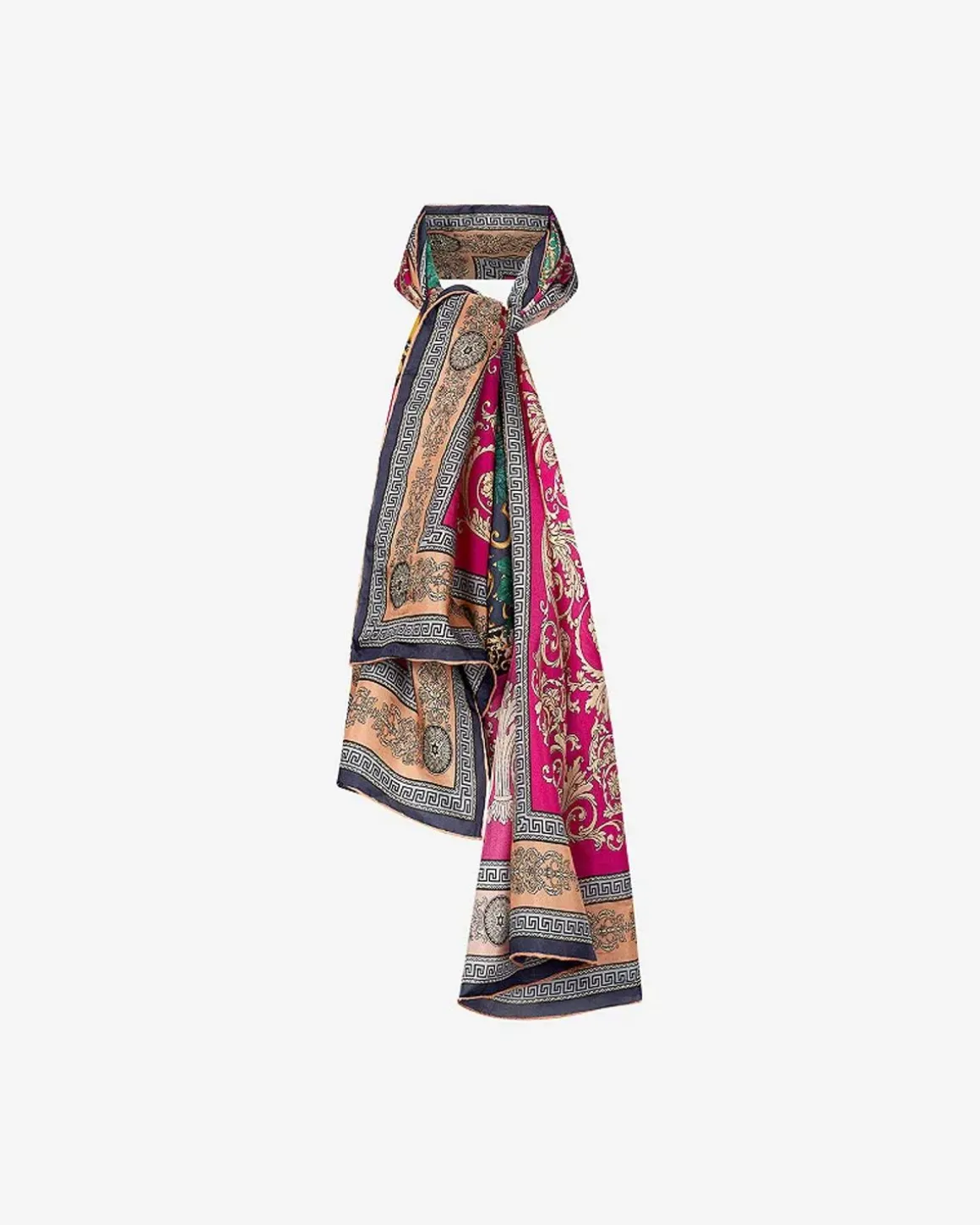 Foulard En 100% Soie Dont L’Imprimé Placé Le Long Du Modèle Apporte Douceur Et Chic Au Modèle.