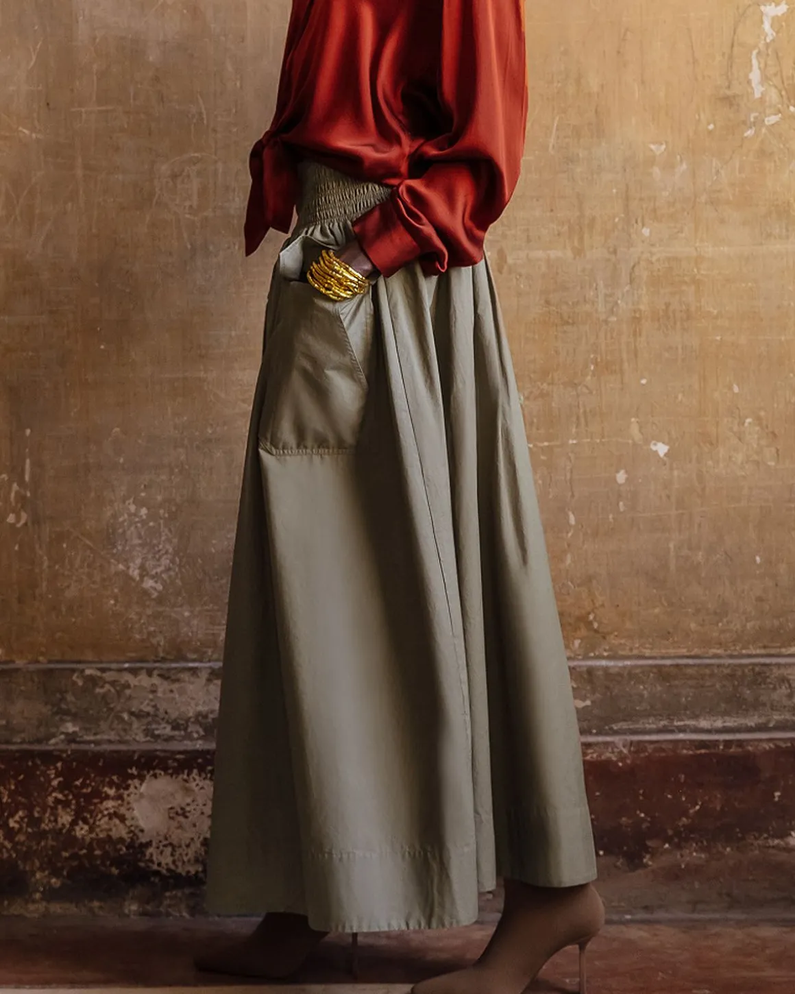Jupe Évasée En Popeline De Coton Craquante Kaki Aux Lignes Essentielles Et À La Base Réalisée En Smocks Appuyés.
