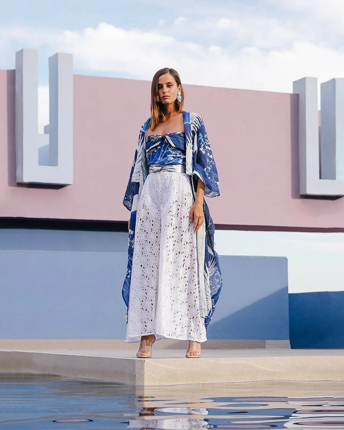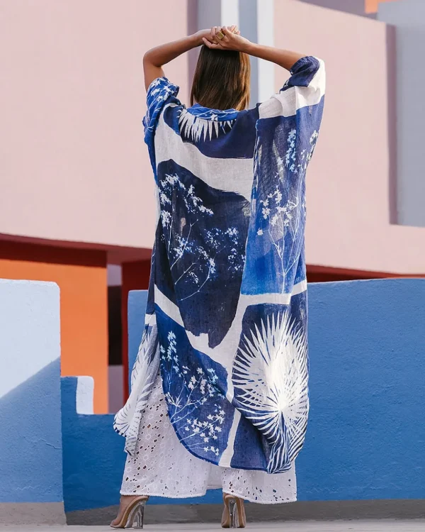 Elégante Alliance D’Un Lin Souple Et D’Un Imprimé Placé À Merveille Sur Ce Kimono Long Dans Les Tons Bleu Et Blanc.