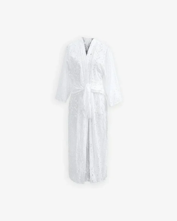Droit Avec Des Manches Longues, Notre Kimono De Couleur Blanche D’Inspiration Japonaise Joue En Contraste Avec Le Tissus Fait De Broderies Anglaises.