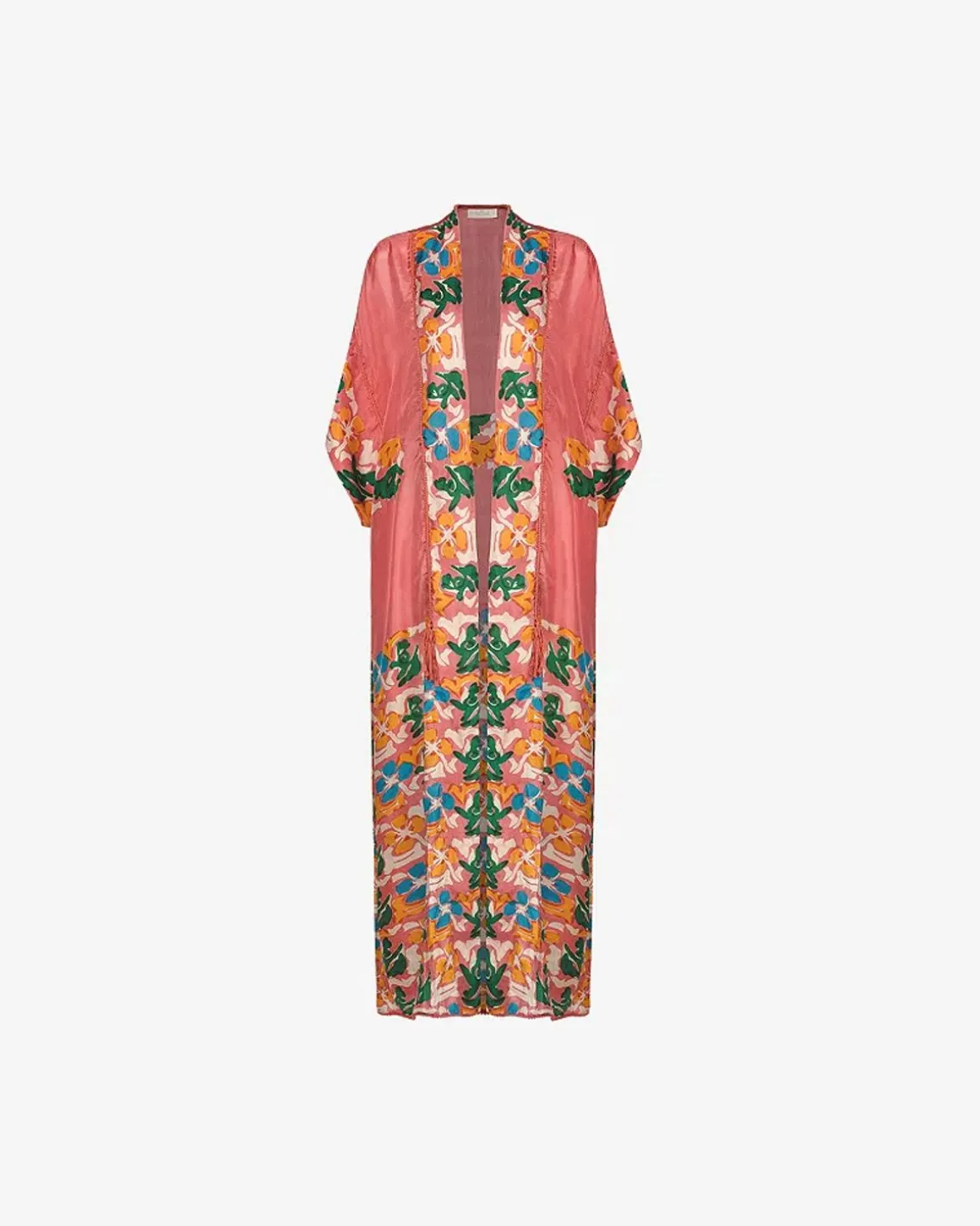 Long Kimono En Soie Rose Avec Imprimé Placé