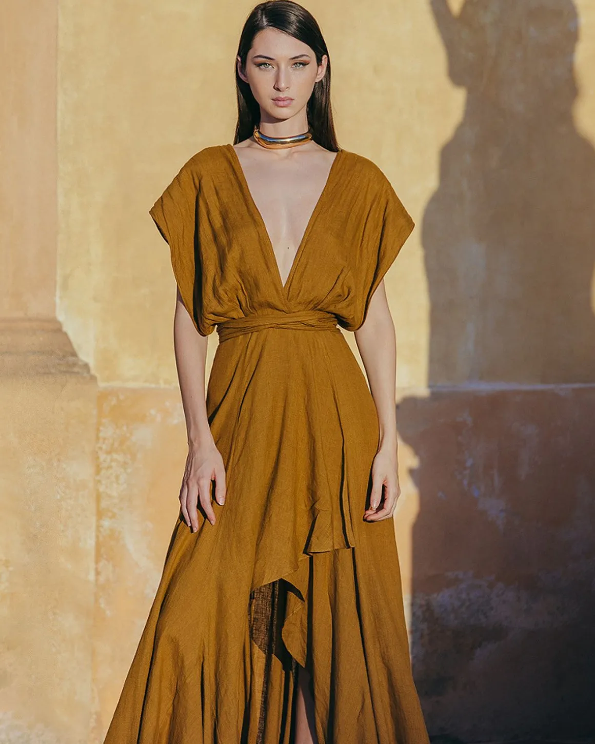 Splendide Longue Robe En Lin De Couleur Bronze Au Volume Enchanteur Et Séduisant.