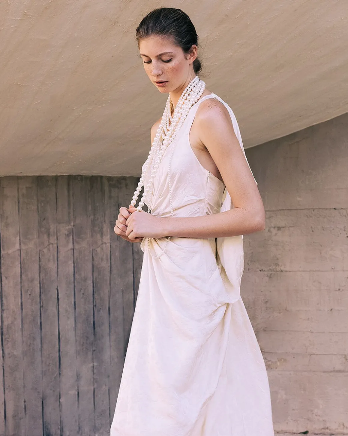 L’Élégance De La Viscose Jacquard Et Du Plissé Sont Associés Pour Notre Splendide Robe Longue. La Féminité Du Modèle Associée À Sa Douce Couleur Écrue Surprend Par La Grâce De Sa Forme Avec Son Délicat Drapé En Forme De Papillon Sur L’Arrière.